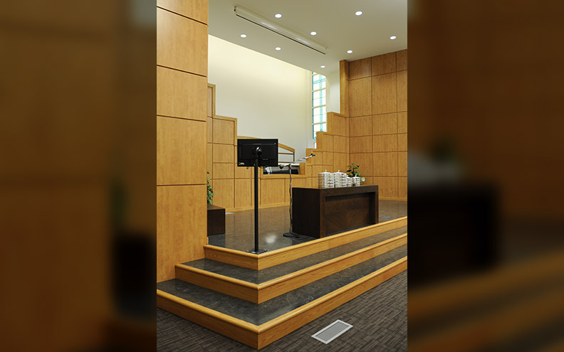 The common areas throughout the church required new flooring and finishes to work with existing wood and brick materials and withstand the use of a robust and family-oriented membership, as well as to accommodate heavy foot traffic from the public when the church hosts events for the community.