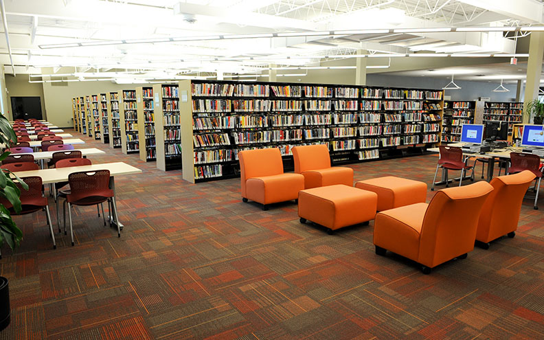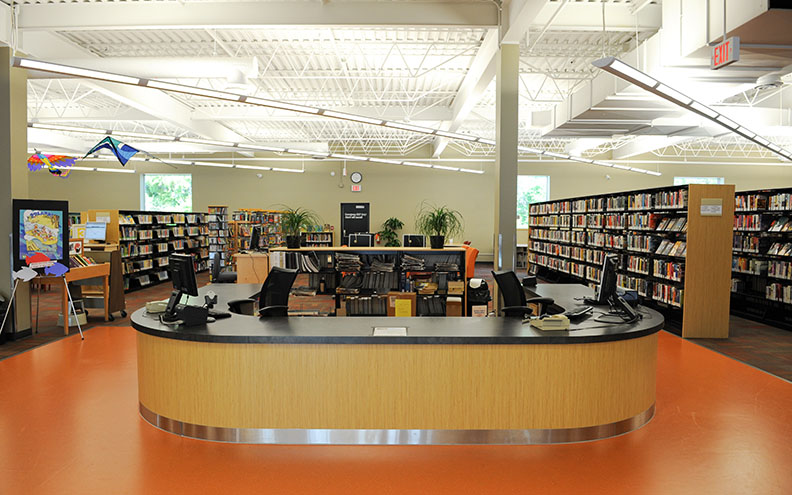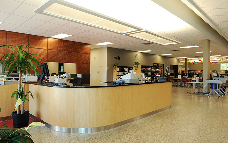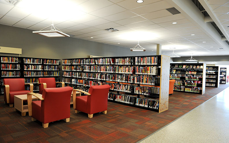 The library was reorganized to incorporate more functions like lounge seating, study tables, young adult area, and a larger kids area with an attractive and functional program room.